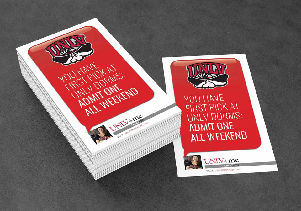 UNLV has been making big changes to increase admissions and inform students about new money-saving housing opportunities that would increase the quality of life for participating members. Partnering with Carvalho Creative in Las Vegas, Nevada, Jina art directed this year-long campaign that featured a visual text-message concept, coupled with actual students in their UNLV housing environment. Thanks to our exceptional social media and word-of-mouth strategies, the campaign was a hit on campus.